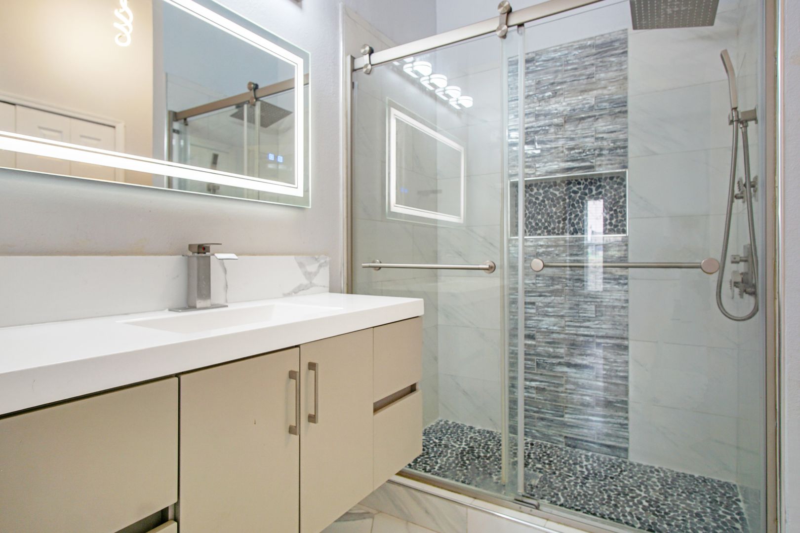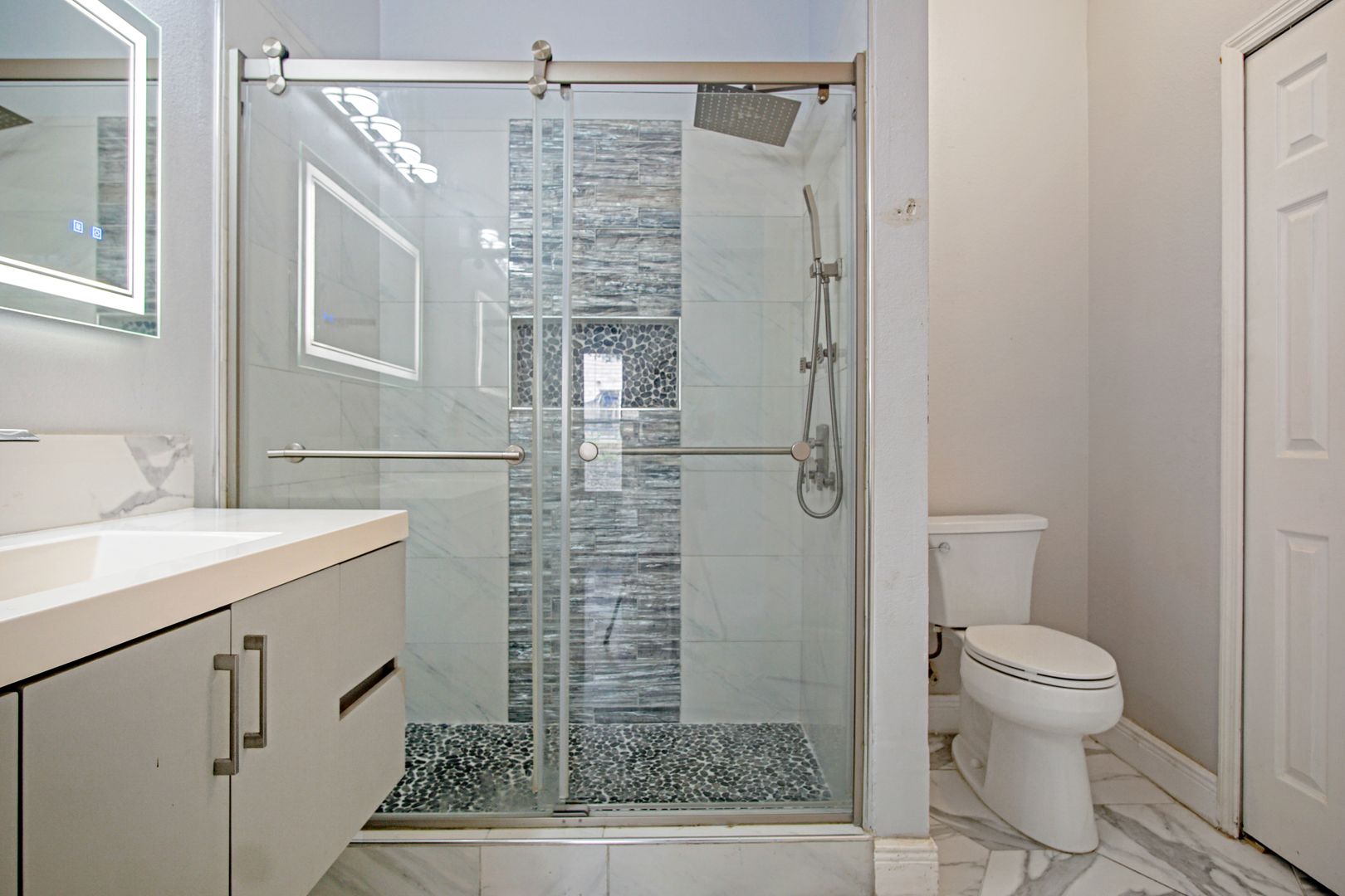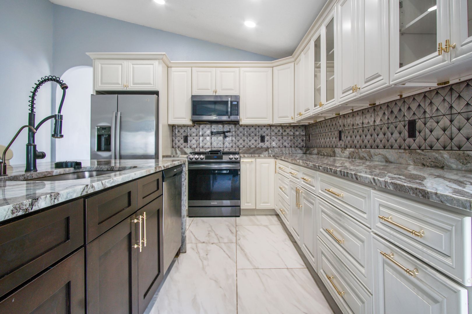 The upgraded kitchen is a true centerpiece of the home, featuring large stone countertops, a spacious island, new appliances, and a gas cooktop — perfect for home chefs and entertainers alike. Ample counter space and modern finishes make this kitchen as functional as it is beautiful.