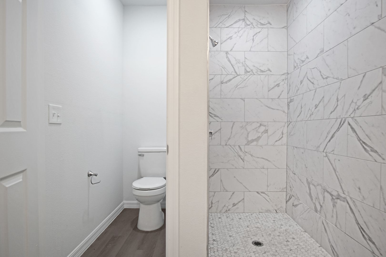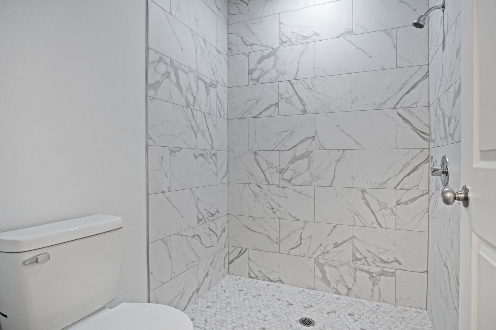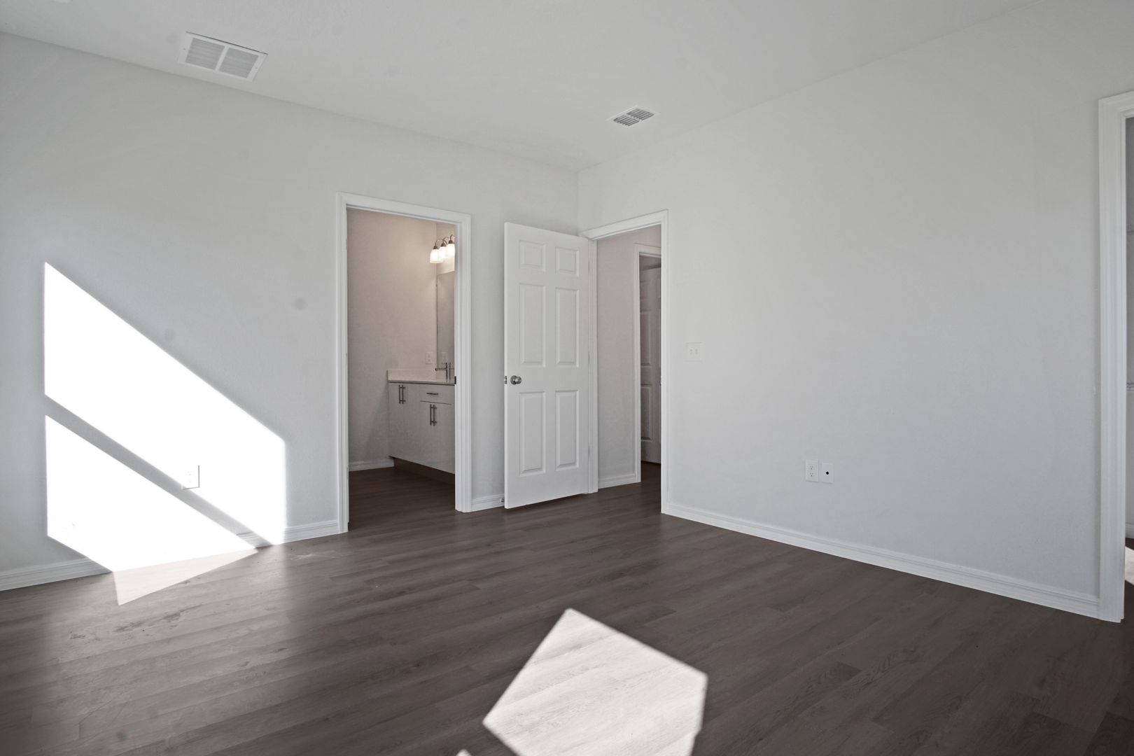 The spacious primary suite offers a peaceful retreat with an en-suite bath featuring dual sinks and a sleek stand-up shower. Two additional bedrooms are generously sized and share a full second bath, while a convenient half-bath serves guests.