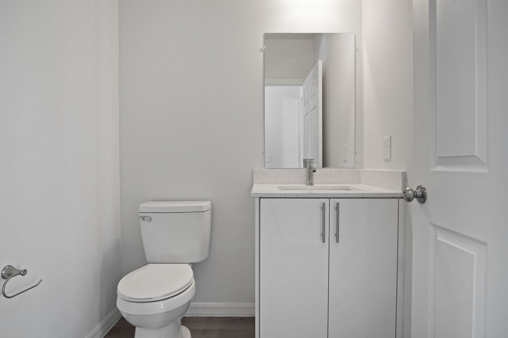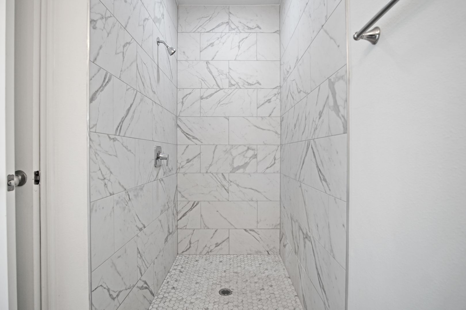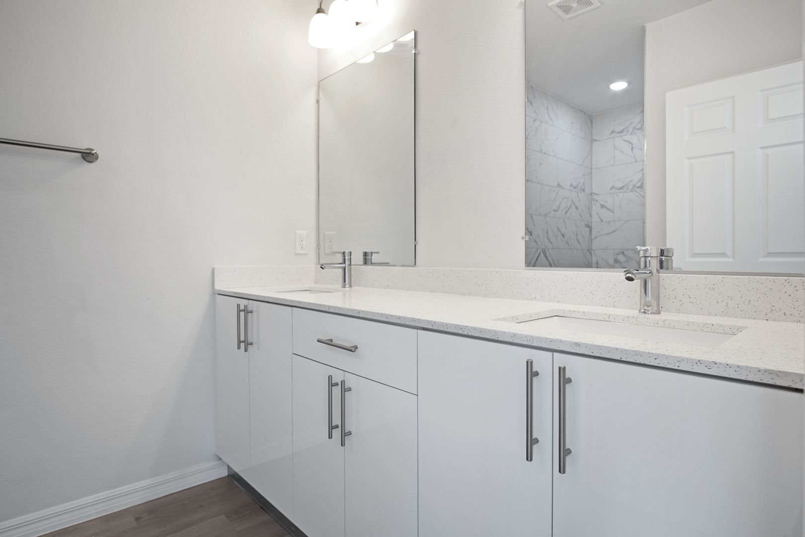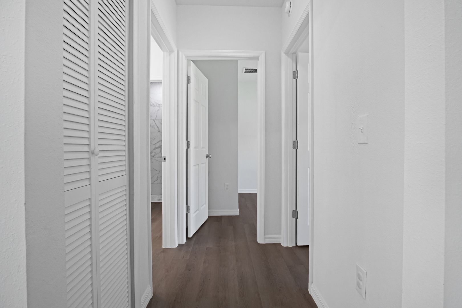 The spacious primary suite offers a peaceful retreat with an en-suite bath featuring dual sinks and a sleek stand-up shower. Two additional bedrooms are generously sized and share a full second bath, while a convenient half-bath serves guests.