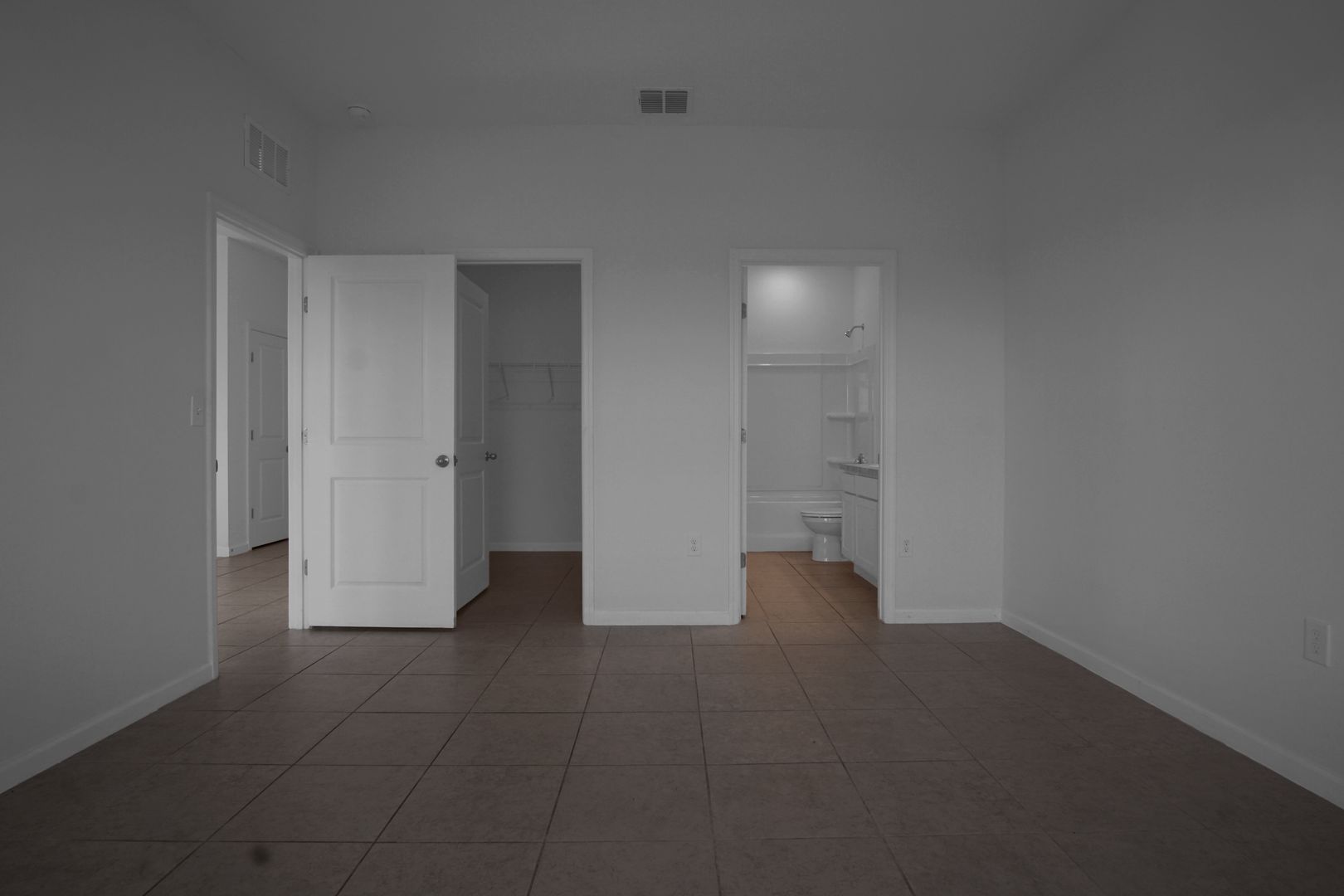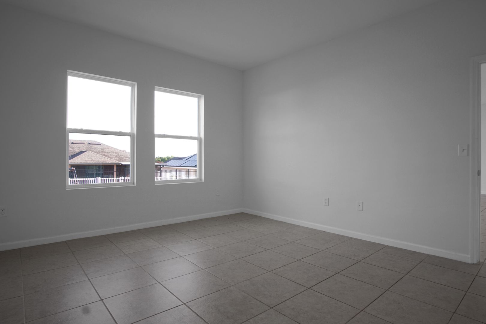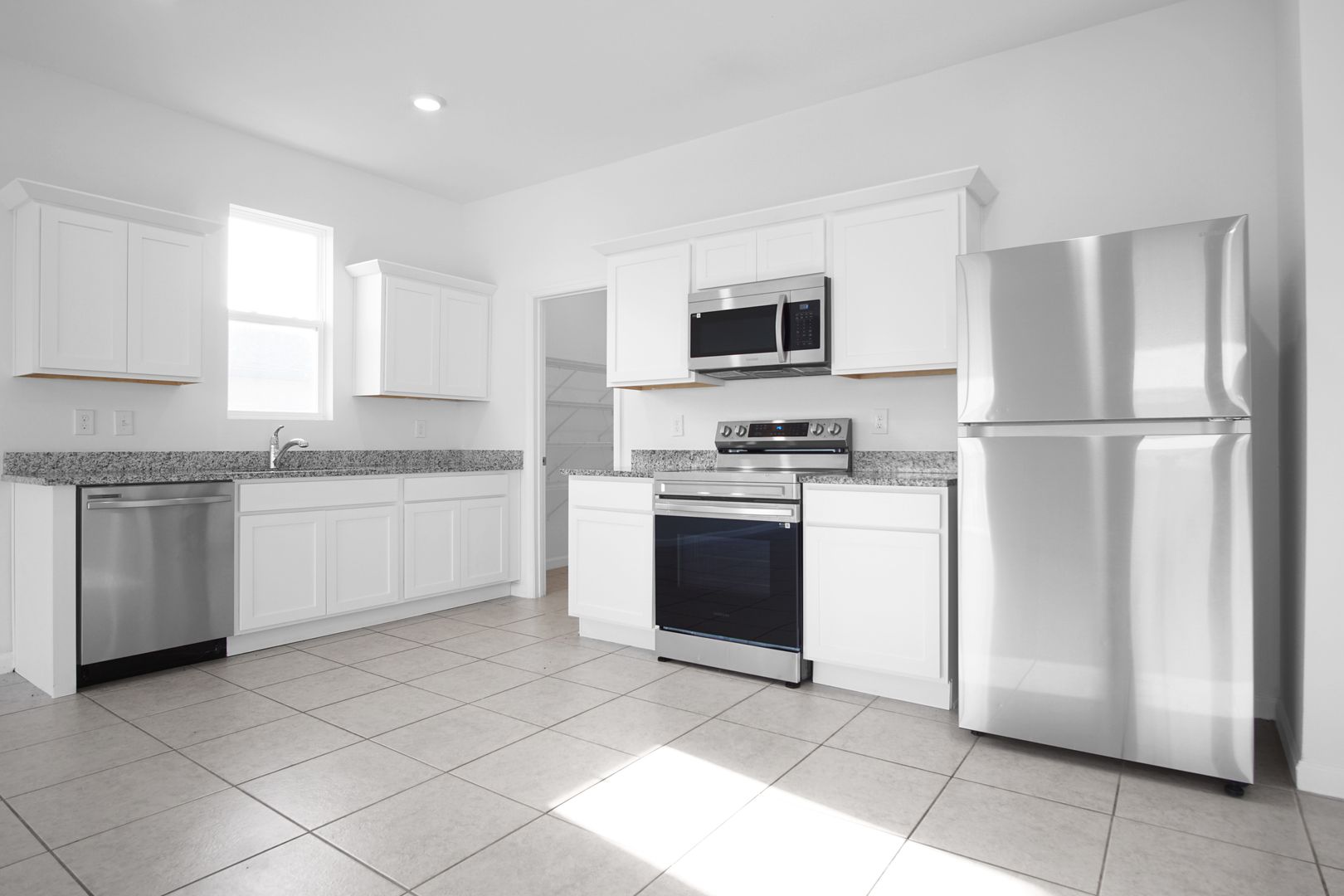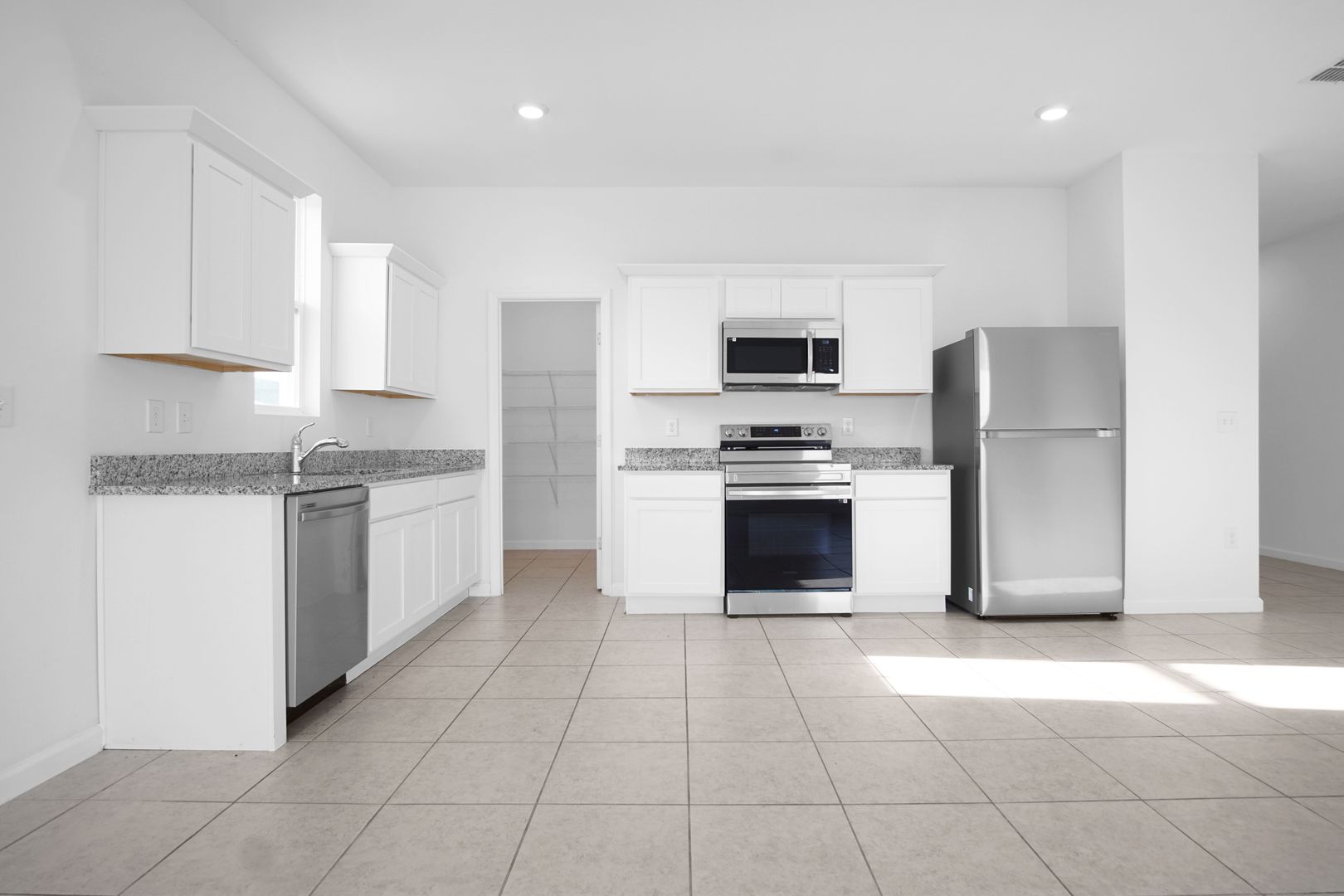 At the rear of the home, the space opens into a large kitchen, living, and dining area. The kitchen features modern cabinetry, matching appliances, and a walk-in pantry. Sliding glass doors provide access to the backyard, and the primary suite is privately located off the main living area, offering a spacious layout, walk-in closet, and en-suite bathroom.